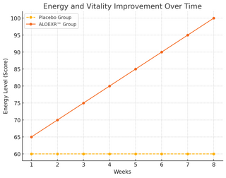 - Energy and Vitality Improvement Over Time: Demonstrates a progressive increase in energy and vitality levels for the ALOEXR™ group over 8 weeks compared to the placebo group.